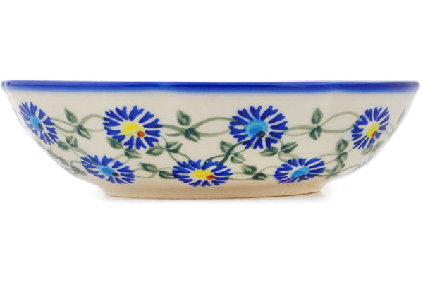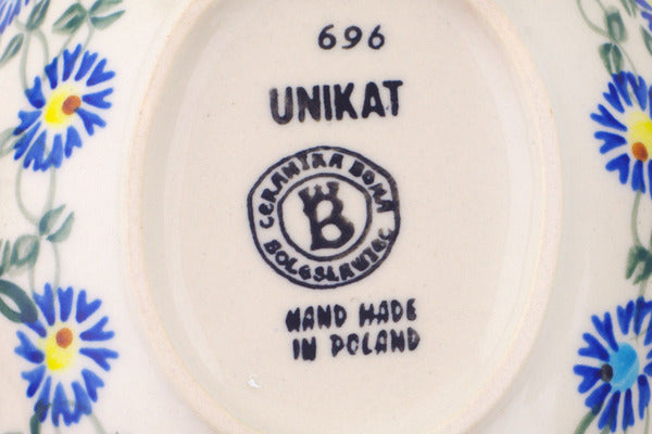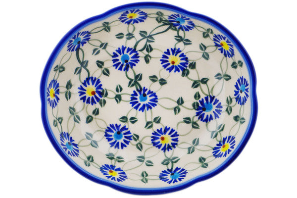 This Polish Pottery Scalloped Bowl is handmade and handpainted by the Ceramika Bona factory in Boleslawiec, Poland. Manufacturer item number H1840R. It is 2" high and measures 6¾" by 6". The capacity of this Scalloped Bowl is 15.08 oz (brimful) and it weighs 0.7 lbs. It is part of the Blue Thistle Beauty Collection.
