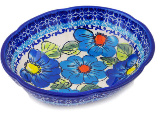 This Polish Pottery Scalloped Bowl is handmade and handpainted by the Ceramika Bona factory in Boleslawiec, Poland. Manufacturer item number H8711Q. It is 2" high and measures 6¾" by 6". The capacity of this Scalloped Bowl is 15.08 oz (brimful) and it weighs 0.7 lbs. It is part of the Bold Blue Poppies Collection.