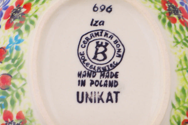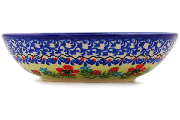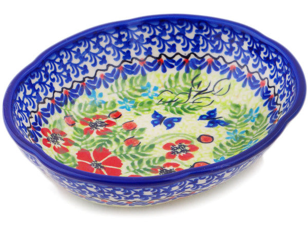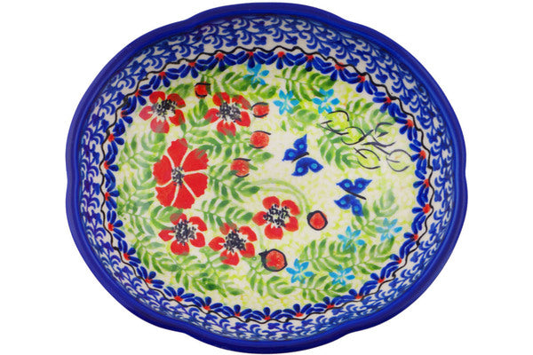 This Polish Pottery Scalloped Bowl is handmade and handpainted by the Ceramika Bona factory in Boleslawiec, Poland. Manufacturer item number H8710Q. It is 2" high and measures 6¾" by 6". The capacity of this Scalloped Bowl is 15.08 oz (brimful) and it weighs 0.7 lbs. It is part of the Metamorphosis Collection.