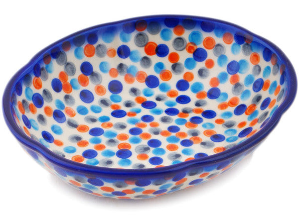 This Polish Pottery Scalloped Bowl is handmade and handpainted by the Ceramika Bona factory in Boleslawiec, Poland. Manufacturer item number H1912R. It is 2" high and measures 6¾" by 6". The capacity of this Scalloped Bowl is 15.08 oz (brimful) and it weighs 0.7 lbs. It is part of the Polka Dot Frenzy Collection.