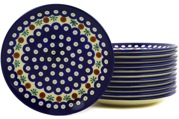 This Polish Pottery Set of 12 Plates is handmade and handpainted by the Zaklady Ceramiczne factory in Boleslawiec, Poland. Manufacturer item number H6624E. It is ¾" high and measures 7½" by 7½". The weight of this Set of 12 Plates is 11.6 lbs. It is part of the Mosquito Collection.