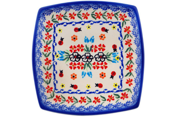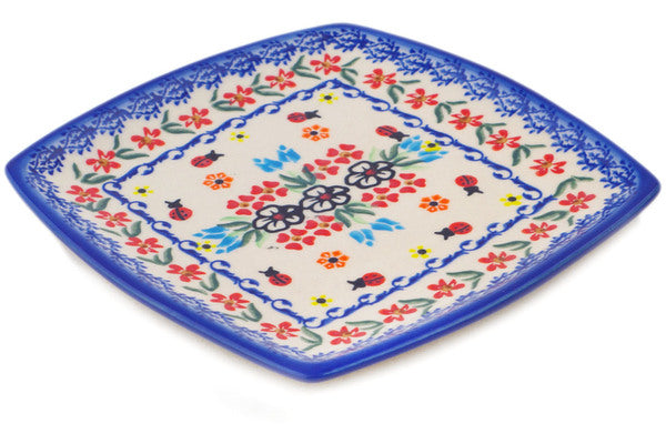 This Polish Pottery Square Plate is handmade and handpainted by the Ceramika Bona factory in Boleslawiec, Poland. Manufacturer item number H3895Q. It is ½" high and measures 7¼" by 7¼". The weight of this Square Plate is 1.0 lbs. It is part of the Fanciful Ladybug Collection.