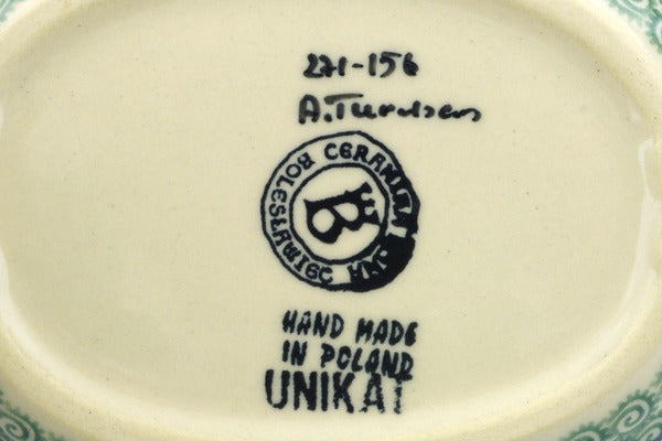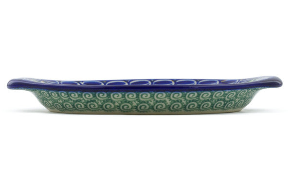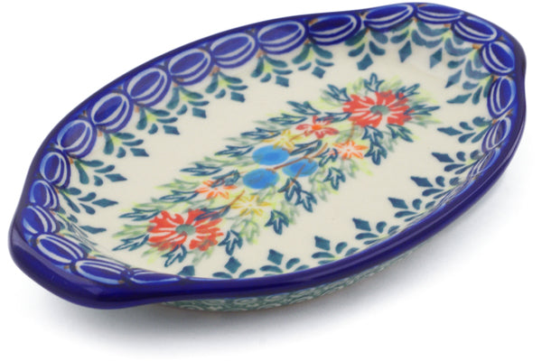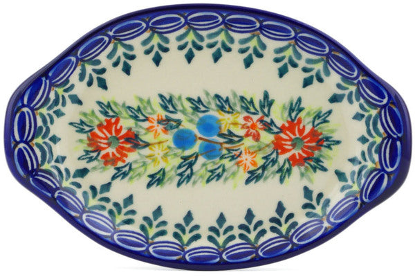 This Polish Pottery Tray with Handles is handmade and handpainted by the Ceramika Bona factory in Boleslawiec, Poland. Manufacturer item number H4535J. It is ¾" high and measures 6½" by 4¼". The capacity of this Tray with Handles is 2.30 oz (brimful) and it weighs 0.5 lbs. It is part of the Ring Of Flowers Collection.
