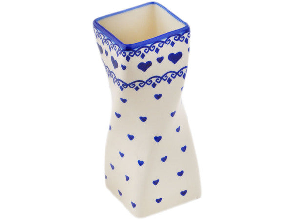 This Polish Pottery Vase is handmade and handpainted by the Ceramika Bona factory in Boleslawiec, Poland. Manufacturer item number H9612O. It is 6¾" high and measures 2½" by 2½". The capacity of this Vase is 15.82 oz (brimful) and it weighs 0.8 lbs. It is part of the Blue Valentine Hearts Collection.