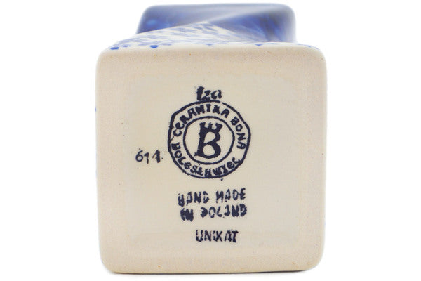 This Polish Pottery Vase is handmade and handpainted by the Ceramika Bona factory in Boleslawiec, Poland. Manufacturer item number H6214O. It is 6¾" high and measures 2½" by 2½". The capacity of this Vase is 15.82 oz (brimful) and it weighs 0.8 lbs. It is part of the Divine Cobalt Collection.