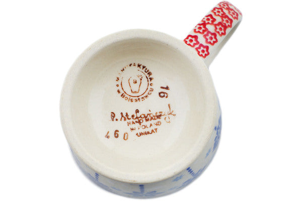This Polish Pottery Mug is handmade and handpainted by the Manufaktura factory in Boleslawiec, Poland. Manufacturer item number H2335P. It is 3½" high and measures 4½" by 3¼". The capacity of this Mug is 7.00 oz (brimful) and it weighs 0.7 lbs. It is part of the Winter Sights Collection.