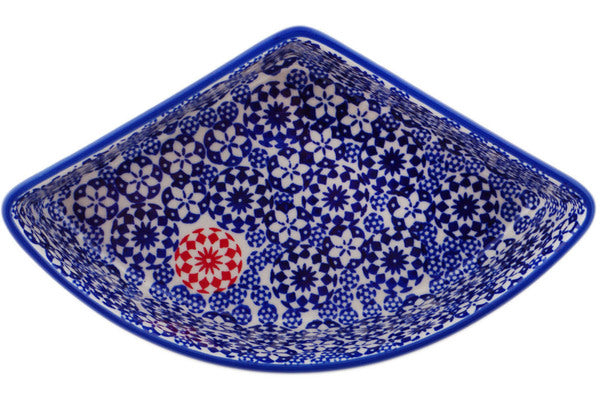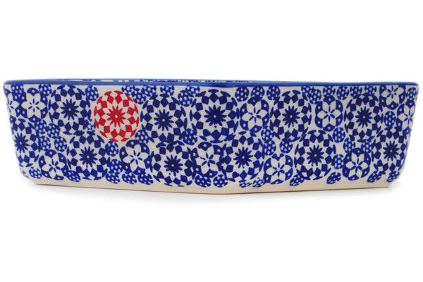 This Polish Pottery Bowl is handmade and handpainted by the Manufaktura factory in Boleslawiec, Poland. Manufacturer item number H8377Q. It is 2¼" high and measures 8½" by 5". The capacity of this Bowl is 18.09 oz (brimful) and it weighs 1.2 lbs. It is part of the Bullseye Collection.