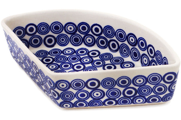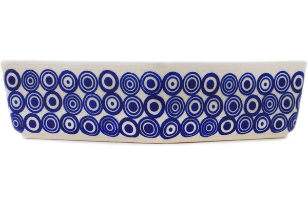 This Polish Pottery Bowl is handmade and handpainted by the Manufaktura factory in Boleslawiec, Poland. Manufacturer item number H4484R. It is 2¼" high and measures 8½" by 5". The capacity of this Bowl is 18.09 oz (brimful) and it weighs 1.2 lbs. It is part of the Cobalt Speckle Collection.