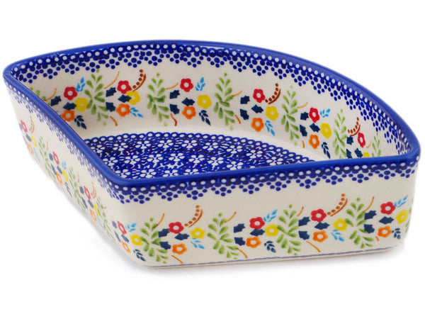 This Polish Pottery Bowl is handmade and handpainted by the Manufaktura factory in Boleslawiec, Poland. Manufacturer item number H8538P. It is 2¼" high and measures 8½" by 5". The capacity of this Bowl is 18.09 oz (brimful) and it weighs 1.2 lbs. It is part of the Rainbow Delight Collection.