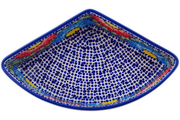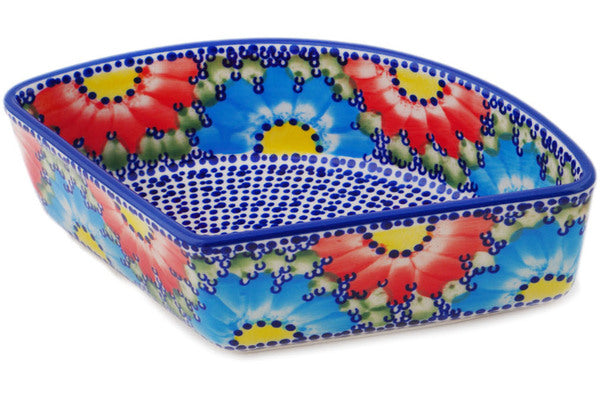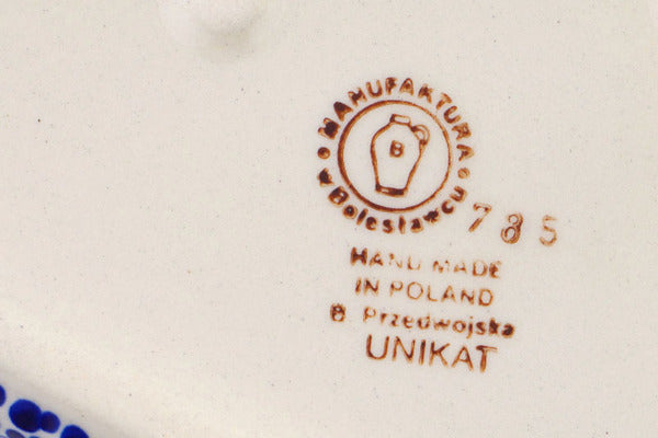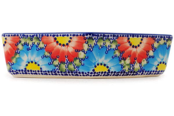 This Polish Pottery Bowl is handmade and handpainted by the Manufaktura factory in Boleslawiec, Poland. Manufacturer item number H8385Q. It is 2¼" high and measures 8½" by 5". The capacity of this Bowl is 18.09 oz (brimful) and it weighs 1.2 lbs. It is part of the Spotted Garden Collection.