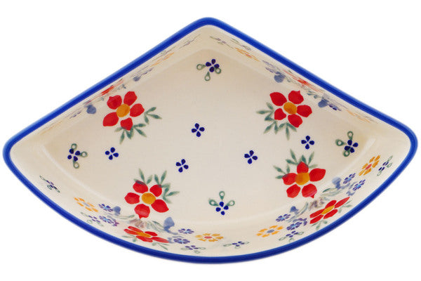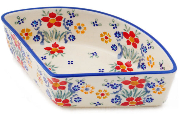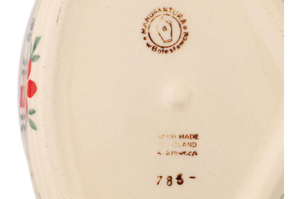 This Polish Pottery Bowl is handmade and handpainted by the Manufaktura factory in Boleslawiec, Poland. Manufacturer item number H8381Q. It is 2¼" high and measures 8½" by 5". The capacity of this Bowl is 18.09 oz (brimful) and it weighs 1.2 lbs. It is part of the Spring's Red Garden Collection.