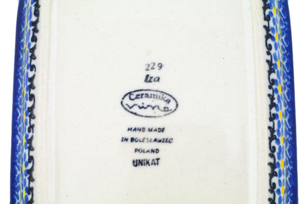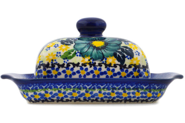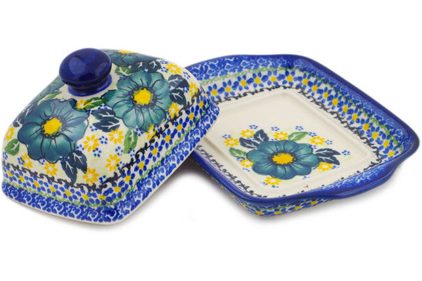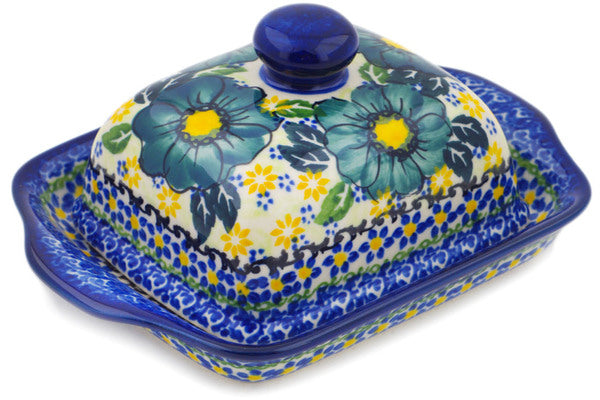 This Polish Pottery Butter Dish is handmade and handpainted by the Ceramika Bona factory in Boleslawiec, Poland. Manufacturer item number H3696P. It is 3½" high and measures 7¾" by 5¾". The weight of this Butter Dish is 1.9 lbs. It is part of the Cadet Blue Flowers Collection.