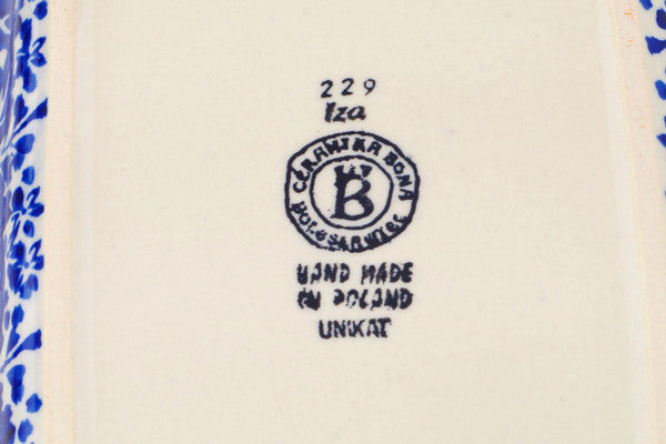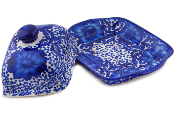 This Polish Pottery Butter Dish is handmade and handpainted by the Ceramika Bona factory in Boleslawiec, Poland. Manufacturer item number H5648P. It is 3½" high and measures 7¾" by 5¾". The weight of this Butter Dish is 1.9 lbs. It is part of the Cobalt Fantasy Collection.