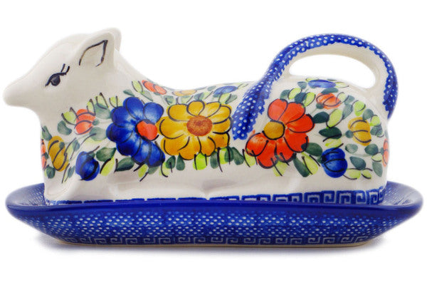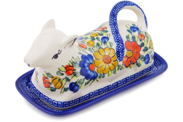 This Polish Pottery Butter Dish is handmade and handpainted by the Ceramika Bona factory in Boleslawiec, Poland. Manufacturer item number H4114Q. It is 4¼" high and measures 8¼" by 4½". The weight of this Butter Dish is 2.1 lbs. It is part of the Fall Garden Collection.