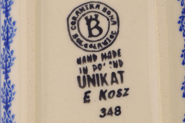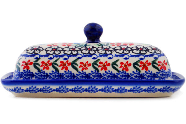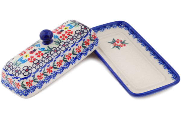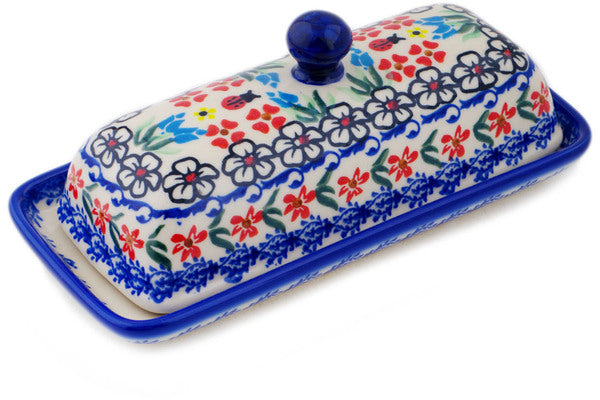 This Polish Pottery Butter Dish is handmade and handpainted by the Ceramika Bona factory in Boleslawiec, Poland. Manufacturer item number H3881Q. It is 2¾" high and measures 7¾" by 3¾". The weight of this Butter Dish is 1.0 lbs. It is part of the Fanciful Ladybug Collection.