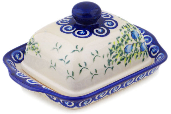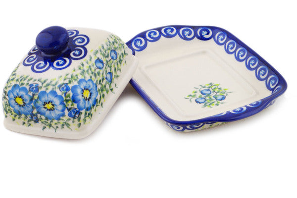 This Polish Pottery Butter Dish is handmade and handpainted by the Ceramika Bona factory in Boleslawiec, Poland. Manufacturer item number H2164R. It is 3½" high and measures 7¾" by 5¾". The weight of this Butter Dish is 1.9 lbs. It is part of the Gorgeous Morning Glory Collection.