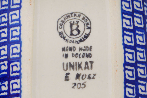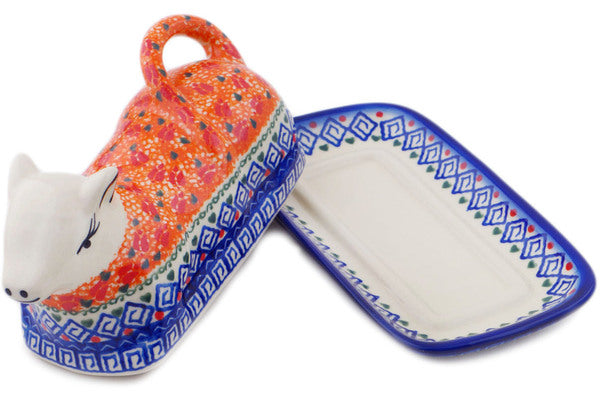 This Polish Pottery Butter Dish is handmade and handpainted by the Ceramika Bona factory in Boleslawiec, Poland. Manufacturer item number H9736Q. It is 4¼" high and measures 8¼" by 4½". The weight of this Butter Dish is 2.1 lbs. It is part of the Grecian Fire Tulips Collection.