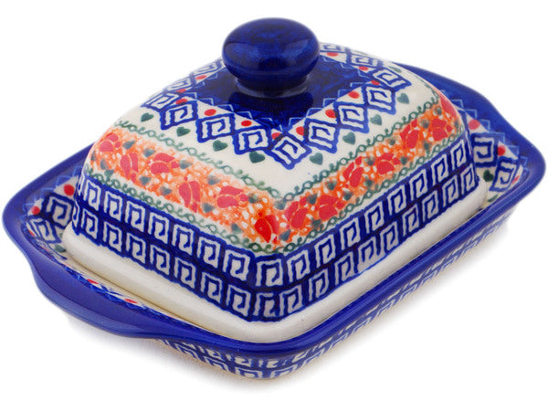 This Polish Pottery Butter Dish is handmade and handpainted by the Ceramika Bona factory in Boleslawiec, Poland. Manufacturer item number H9660Q. It is 3½" high and measures 7¾" by 5¾". The weight of this Butter Dish is 1.9 lbs. It is part of the Grecian Fire Tulips Collection.