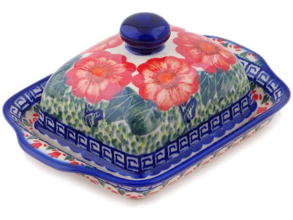This Polish Pottery Butter Dish is handmade and handpainted by the Ceramika Bona factory in Boleslawiec, Poland. Manufacturer item number H3145Q. It is 3½" high and measures 7¾" by 5¾". The weight of this Butter Dish is 1.9 lbs. It is part of the Happiness Collection.