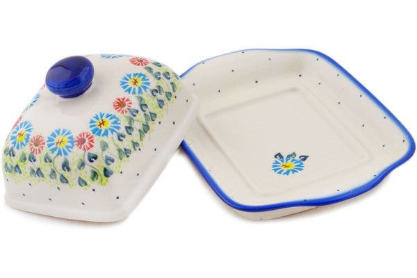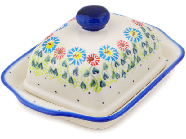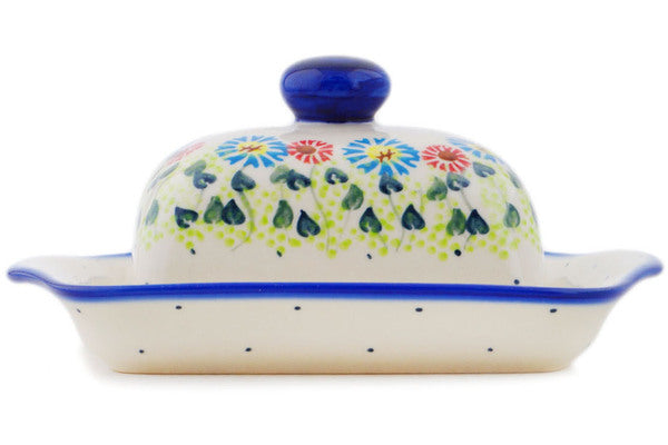 This Polish Pottery Butter Dish is handmade and handpainted by the Ceramika Bona factory in Boleslawiec, Poland. Manufacturer item number H2059R. It is 3½" high and measures 7¾" by 5¾". The weight of this Butter Dish is 1.9 lbs. It is part of the Long-stemmed Beauties Collection.