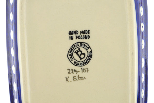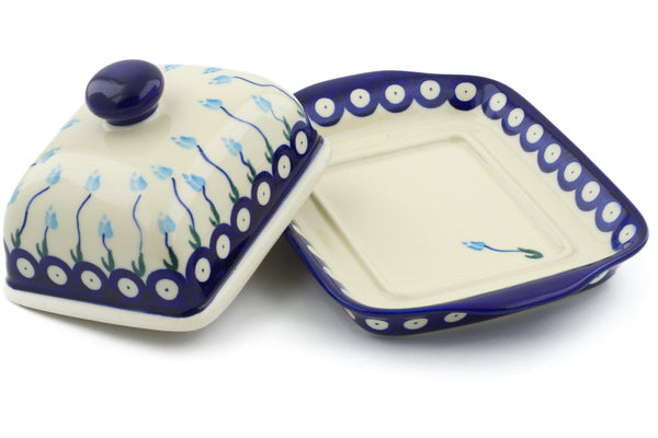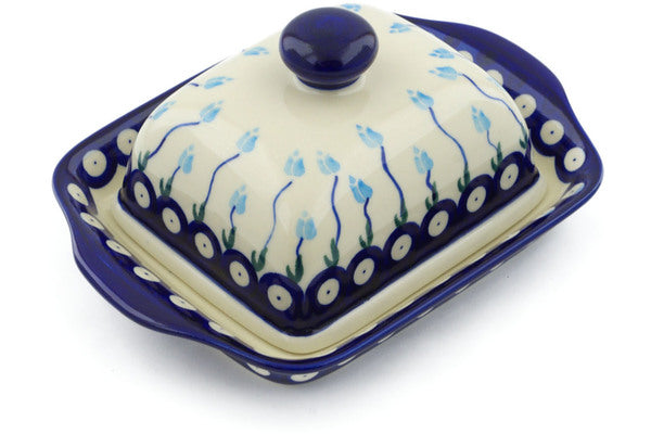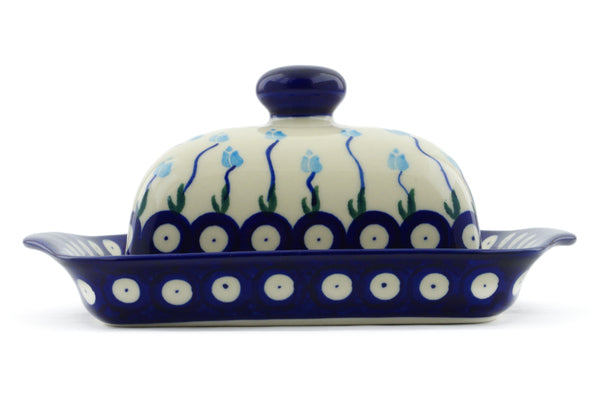 This Polish Pottery Butter Dish is handmade and handpainted by the Ceramika Bona factory in Boleslawiec, Poland. Manufacturer item number H3143J. It is 3½" high and measures 7¾" by 5¾". The weight of this Butter Dish is 1.9 lbs. It is part of the Peacock Tulip Garden Collection.