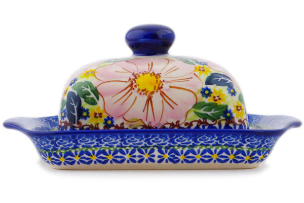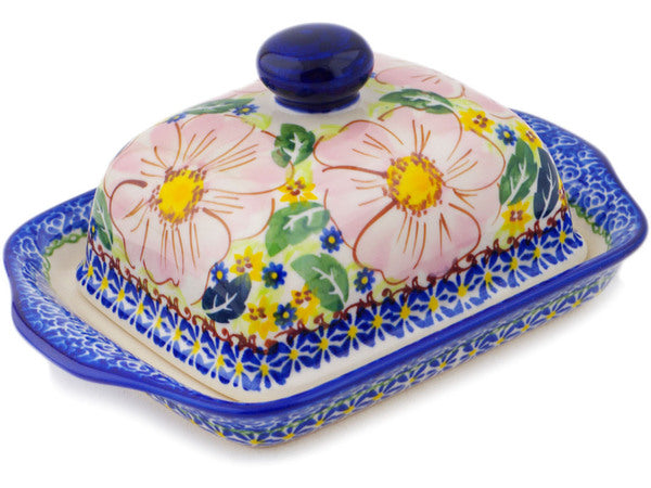 This Polish Pottery Butter Dish is handmade and handpainted by the Ceramika Nina factory in Boleslawiec, Poland. Manufacturer item number H3295P. It is 3½" high and measures 7¾" by 5¾". The weight of this Butter Dish is 1.9 lbs. It is part of the Pink Delight Collection.