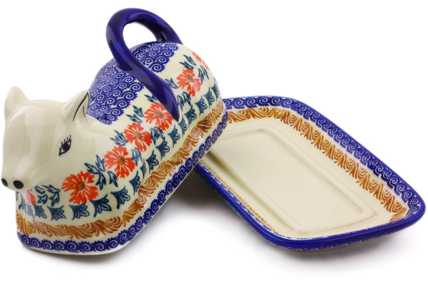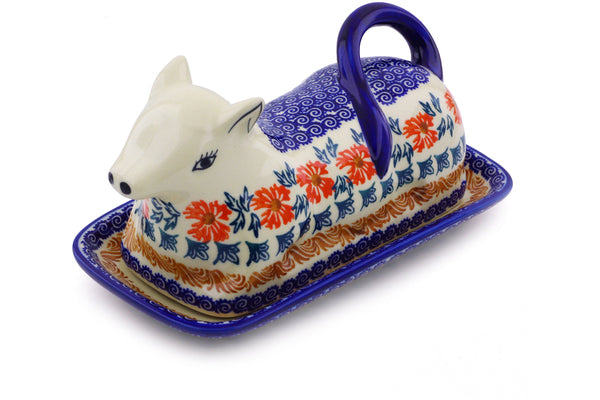 This Polish Pottery Butter Dish is handmade and handpainted by the Ceramika Bona factory in Boleslawiec, Poland. Manufacturer item number H9829I. It is 4¼" high and measures 8¼" by 4½". The weight of this Butter Dish is 2.1 lbs. It is part of the Red Cornflower Collection.