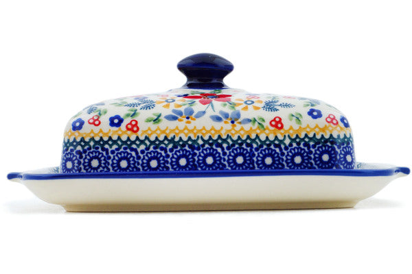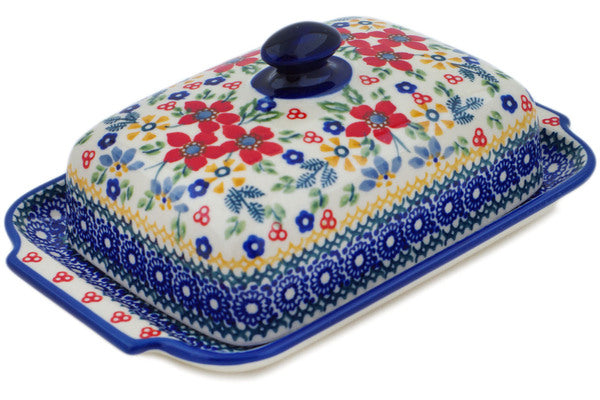This Polish Pottery Butter Dish is handmade and handpainted by the Manufaktura factory in Boleslawiec, Poland. Manufacturer item number H0250O. It is 3¼" high and measures 7¾" by 5". The weight of this Butter Dish is 1.6 lbs. It is part of the Ruby Bouquet Collection.