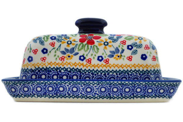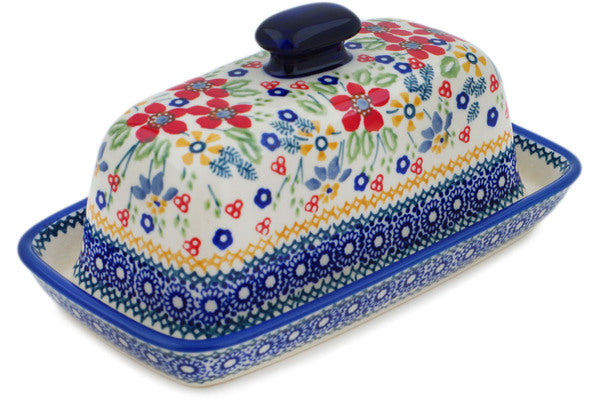 This Polish Pottery Butter Dish is handmade and handpainted by the Manufaktura factory in Boleslawiec, Poland. Manufacturer item number H0248O. It is 4" high and measures 7¾" by 4½". The weight of this Butter Dish is 1.7 lbs. It is part of the Ruby Bouquet Collection.
