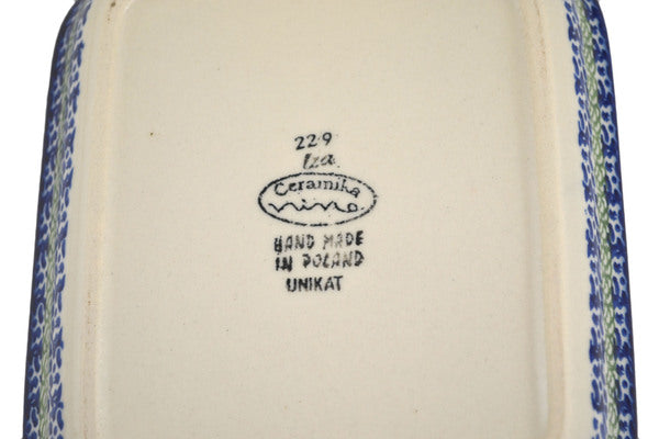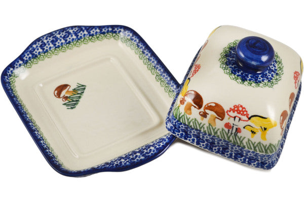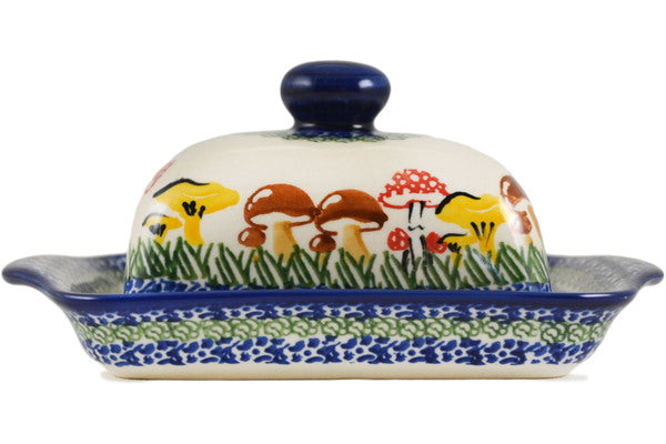 This Polish Pottery Butter Dish is handmade and handpainted by the Ceramika Nina factory in Boleslawiec, Poland. Manufacturer item number H2613P. It is 3½" high and measures 7¾" by 5¾". The weight of this Butter Dish is 1.9 lbs. It is part of the Wild Mushroom Picking Collection.