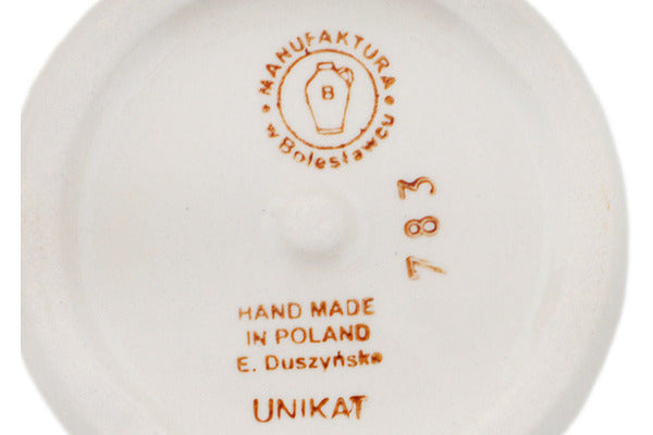 This is a Polish pottery Unikat (Signature) Candle Holder, which means that it has been hand painted with both sponges and brushes and it is signed by the artist who painted it. Unikat pieces are the most intricate works of art. Larger Unikat items take hours of very careful work to finish.