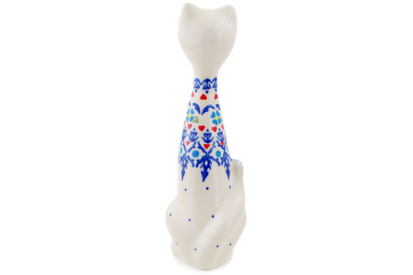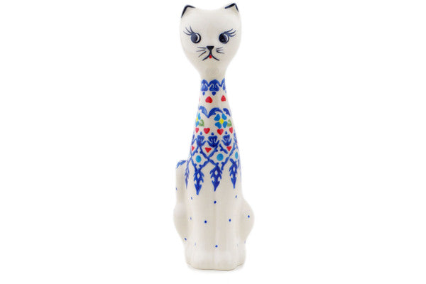 This Polish Pottery Cat Figurine is handmade and handpainted by the Ceramika Bona factory in Boleslawiec, Poland. Manufacturer item number H4072Q. It is 8¼" high and measures 2¼" by 2¼". The weight of this Cat Figurine is 0.8 lbs. It is part of the Graphic Armor Collection.