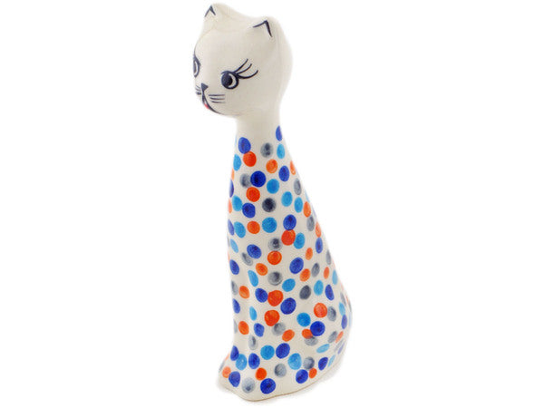 This Polish Pottery Cat Figurine is handmade and handpainted by the Ceramika Bona factory in Boleslawiec, Poland. Manufacturer item number H9828Q. It is 8¼" high and measures 2¼" by 2¼". The weight of this Cat Figurine is 0.8 lbs. It is part of the Polka Dot Frenzy Collection.