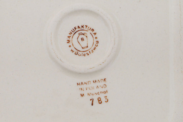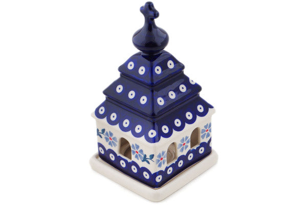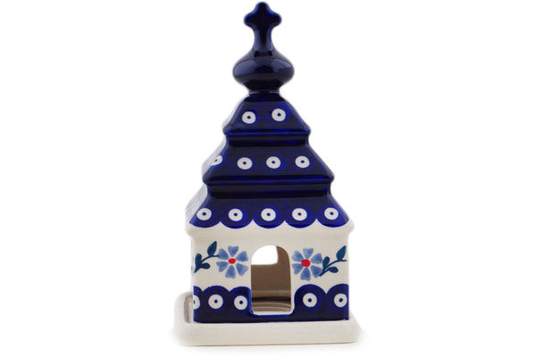 This Polish Pottery Chapel Candle Holder is handmade and handpainted by the Manufaktura factory in Boleslawiec, Poland. Manufacturer item number H7170O. It is 8¼" high and measures 4½" by 4½". The weight of this Chapel Candle Holder is 1.7 lbs. It is part of the Peacock Forget-Me-Not Collection.