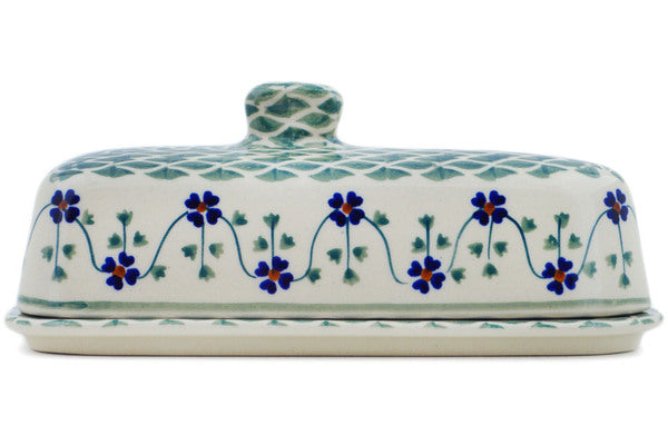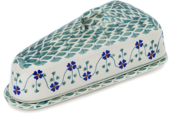 This Polish Pottery Cheese Dish is handmade and handpainted by the Manufaktura factory in Boleslawiec, Poland. Manufacturer item number H6627O. It is 3¼" high and measures 8" by 4¼". The weight of this Cheese Dish is 1.5 lbs. It is part of the Lucky Blue Clover Collection.