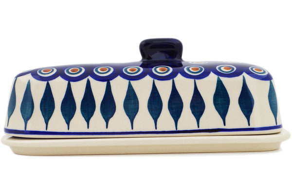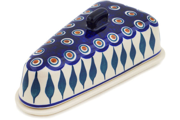 This Polish Pottery Cheese Dish is handmade and handpainted by the Manufaktura factory in Boleslawiec, Poland. Manufacturer item number H6400O. It is 3¼" high and measures 8" by 4¼". The weight of this Cheese Dish is 1.5 lbs. It is part of the Peacock Collection.