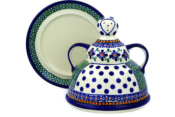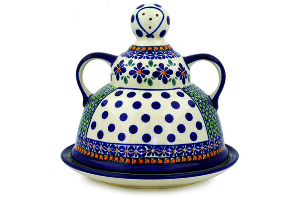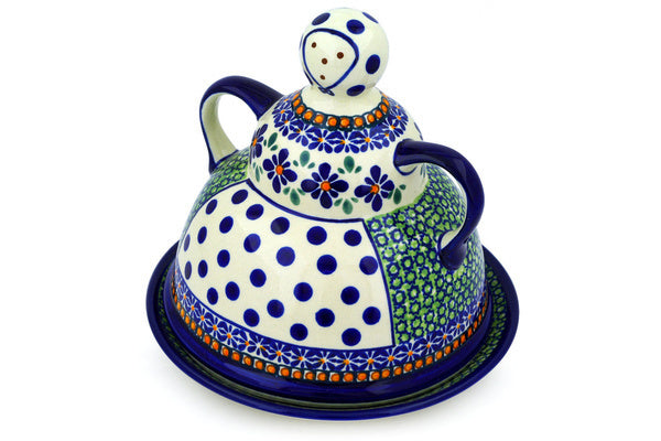 This Polish Pottery Cheese Lady is handmade and handpainted by the Zaklady Ceramiczne factory in Boleslawiec, Poland. Manufacturer item number H8335C. It is 7½" high and measures 7¾" by 7¾". The weight of this Cheese Lady is 3.0 lbs. It is part of the Gingham Flowers Collection.