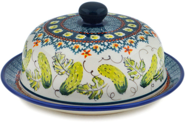 This Polish Pottery Dish with Cover is handmade and handpainted by the Zaklady Ceramiczne factory in Boleslawiec, Poland. Manufacturer item number H1465N. It is 4" high and measures 7¾" by 7¾". The weight of this Dish with Cover is 2.3 lbs. It is part of the Cucumber Patch Collection.