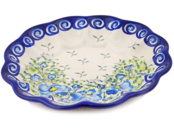 This Polish Pottery Egg Plate is handmade and handpainted by the Ceramika Bona factory in Boleslawiec, Poland. Manufacturer item number H2092R. It is 1½" high and measures 8½" by 8½". The weight of this Egg Plate is 1.2 lbs. It is part of the Gorgeous Morning Glory Collection.
