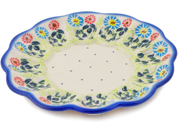 This Polish Pottery Egg Plate is handmade and handpainted by the Ceramika Bona factory in Boleslawiec, Poland. Manufacturer item number H2070R. It is 1½" high and measures 8½" by 8½". The weight of this Egg Plate is 1.2 lbs. It is part of the Long-stemmed Beauties Collection.