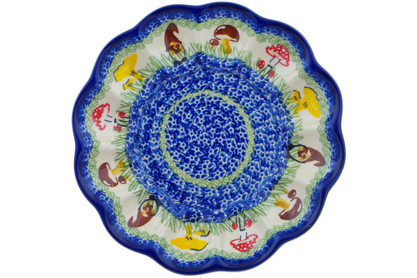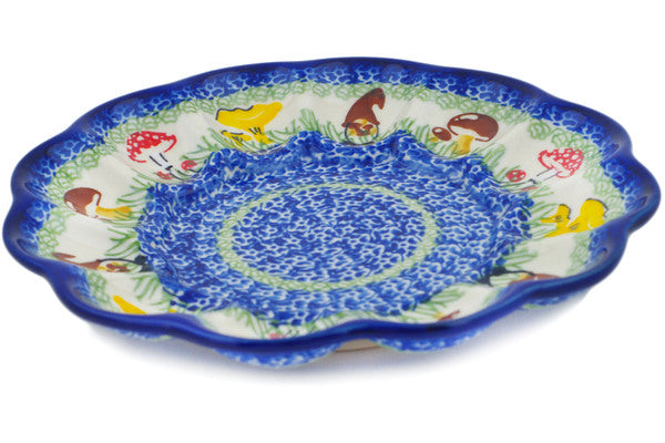 This Polish Pottery Egg Plate is handmade and handpainted by the Ceramika Nina factory in Boleslawiec, Poland. Manufacturer item number H1375P. It is 1½" high and measures 8½" by 8½". The weight of this Egg Plate is 1.2 lbs. It is part of the Mushroom Garden Collection.