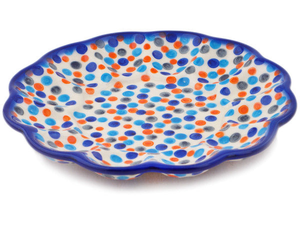 This Polish Pottery Egg Plate is handmade and handpainted by the Ceramika Bona factory in Boleslawiec, Poland. Manufacturer item number H1949R. It is 1½" high and measures 8½" by 8½". The weight of this Egg Plate is 1.2 lbs. It is part of the Polka Dot Frenzy Collection.