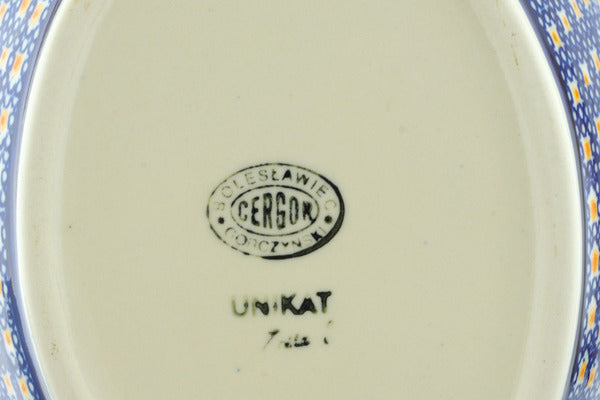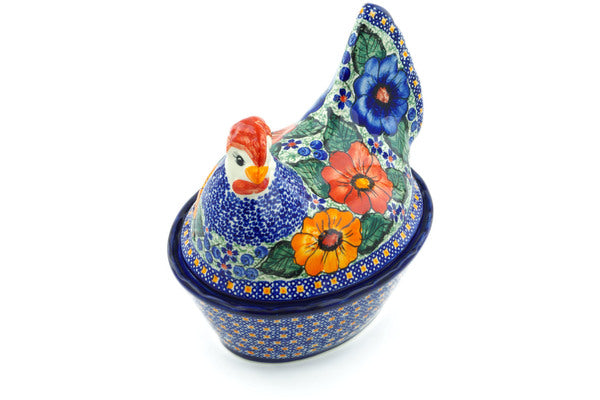This is a Polish pottery Unikat (Signature) Hen Shaped Jar, which means that it has been hand painted with both sponges and brushes and it is signed by the artist who painted it. Unikat pieces are the most intricate works of art. Larger Unikat items take hours of very careful work to finish.