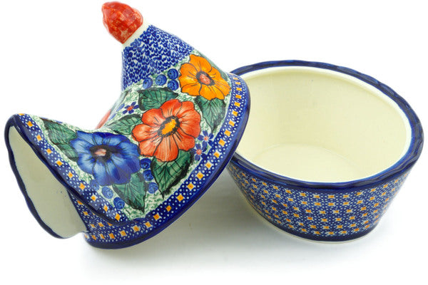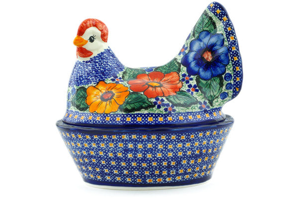 This Polish Pottery Hen Shaped Jar is handmade and handpainted by the Cergor factory in Boleslawiec, Poland. Manufacturer item number H5190J. It is 7¾" high and measures 7¾" by 6". The weight of this Hen Shaped Jar is 2.3 lbs. It is part of the Bold Pansy Collection.