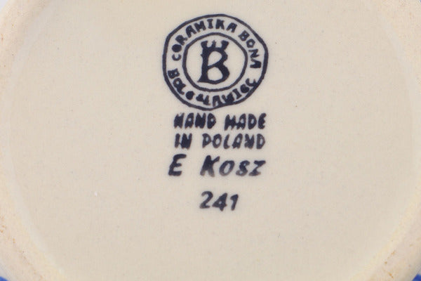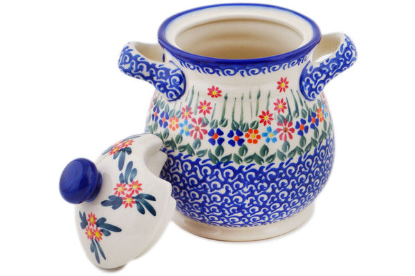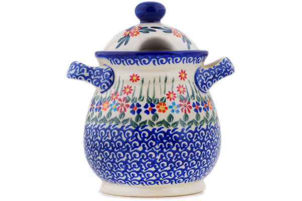 This Polish Pottery Jar with Lid and Handles is handmade and handpainted by the Ceramika Bona factory in Boleslawiec, Poland. Manufacturer item number H4034Q. It is 8" high and measures 7" by 6". The capacity of this Jar with Lid and Handles is 48.52 oz (brimful) and it weighs 3.0 lbs. It is part of the Blissful Daisy Collection.