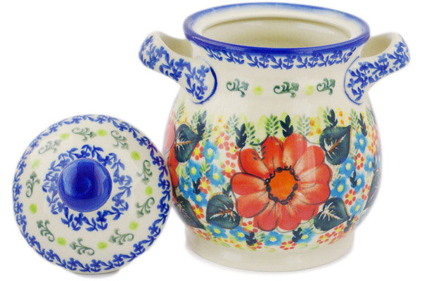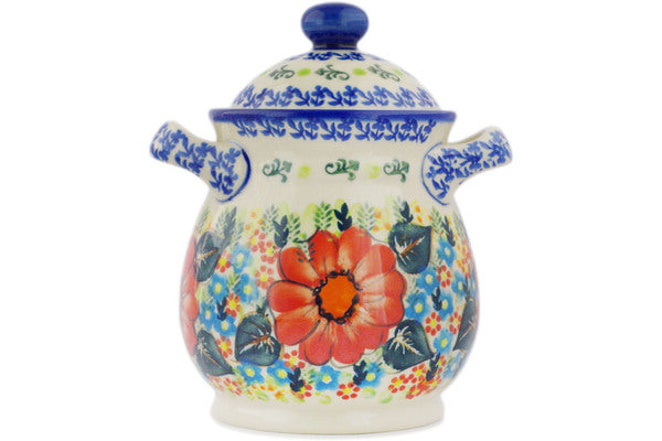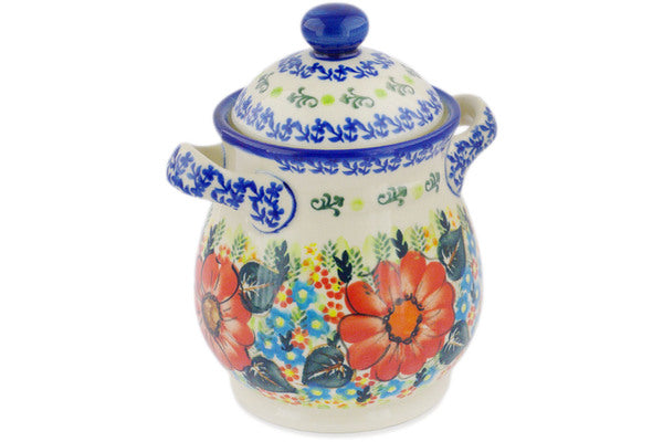 This Polish Pottery Jar with Lid and Handles is handmade and handpainted by the Ceramika Bona factory in Boleslawiec, Poland. Manufacturer item number H6752R. It is 8" high and measures 7" by 6". The capacity of this Jar with Lid and Handles is 48.52 oz (brimful) and it weighs 3.0 lbs. It is part of the Bold Red Poppies Collection.