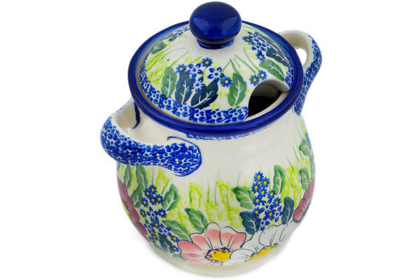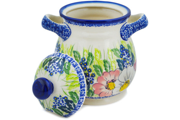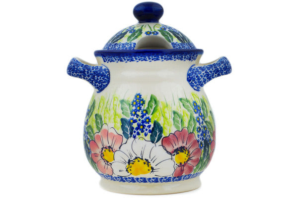 This Polish Pottery Jar with Lid and Handles is handmade and handpainted by the Ceramika Nina factory in Boleslawiec, Poland. Manufacturer item number H1646P. It is 8" high and measures 7" by 6". The capacity of this Jar with Lid and Handles is 48.52 oz (brimful) and it weighs 3.0 lbs. It is part of the Maroon Blossoms Collection.