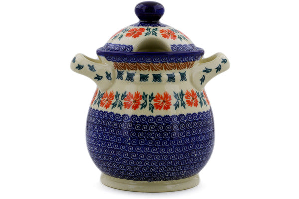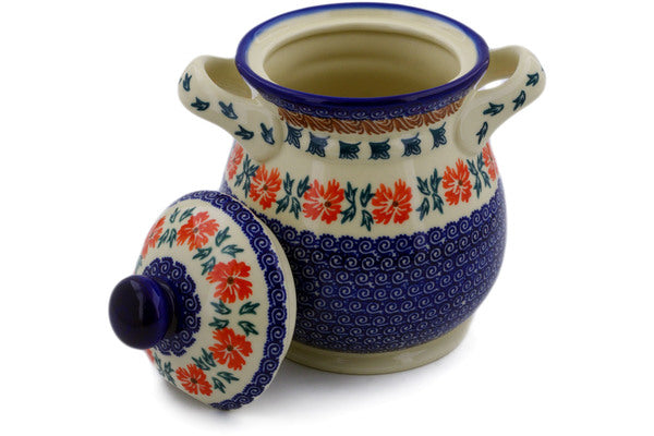 This Polish Pottery Jar with Lid and Handles is handmade and handpainted by the Ceramika Bona factory in Boleslawiec, Poland. Manufacturer item number H7118J. It is 8" high and measures 7" by 6". The capacity of this Jar with Lid and Handles is 48.52 oz (brimful) and it weighs 3.0 lbs. It is part of the Red Cornflower Collection.