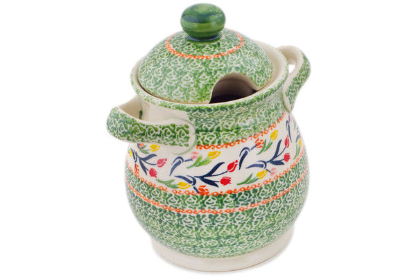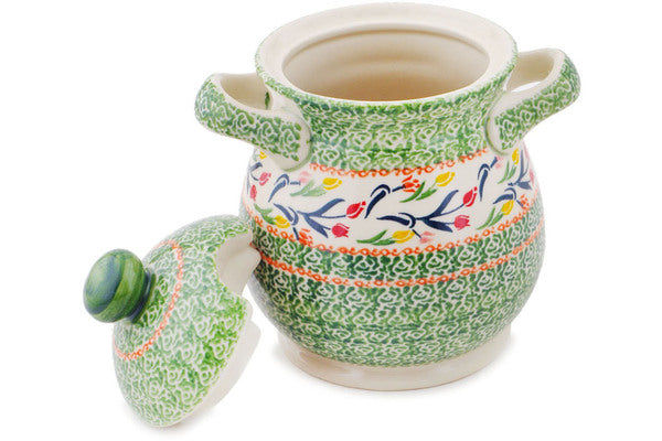 This Polish Pottery Jar with Lid and Handles is handmade and handpainted by the Ceramika Bona factory in Boleslawiec, Poland. Manufacturer item number H3721P. It is 8" high and measures 7" by 6". The capacity of this Jar with Lid and Handles is 48.52 oz (brimful) and it weighs 3.0 lbs. It is part of the Tulip Ring Collection.