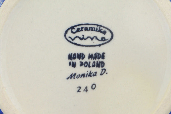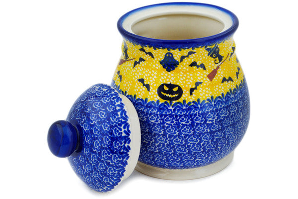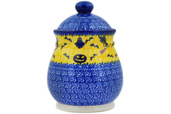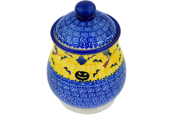 This Polish Pottery Jar with Lid is handmade and handpainted by the Ceramika Nina factory in Boleslawiec, Poland. Manufacturer item number H3318P. It is 8" high and measures 7" by 6". The capacity of this Jar with Lid is 46.33 oz (brimful) and it weighs 2.9 lbs. It is part of the Halloween Evening Collection.